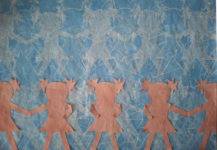 I have been in the studio, continuing work on the Unexpected project (pictured above). I painted more pink paper to create more paperdolls. The current ones are fine; I just felt the need for a few extras because I want some stand-alone, posable ones (they are sassy dolls and determined to express their feelings). I’m having fun! I attached the first group Saturday, and I love the sass of their hands on their hips.