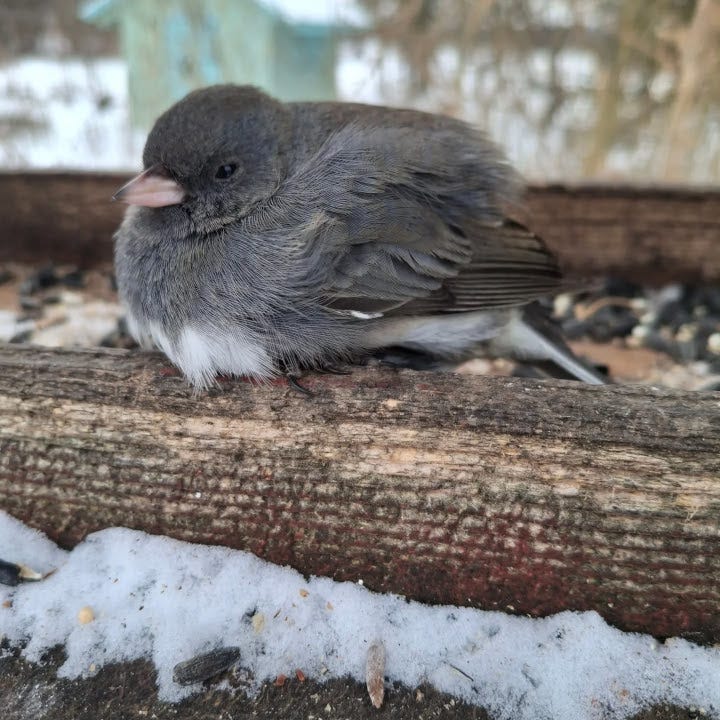 This sweet little Junco hit our dining room window on Saturday morning. I was up in the studio when I heard her hit, so I ran outside, and I found her stunned, lying in the snow. I scooped her up and kept her warm, hoping that she would recover. I had to rescue her three times from Harper Lee when she tried to fly, but she kept fluttering and falling into the snow. (Kitty was happy to see me outside, so she was only being her usual self, greeting me with meows and purring her heart out. I think she was curious and impressed by my ability to “catch a bird”. The wee bird passed away an hour later after my best efforts to keep her warm and safe. It is very likely she had internal injuries and went into shock. She was so small, fragile, warm. I felt her little heart beating in the palm of my hand. Then stillness.