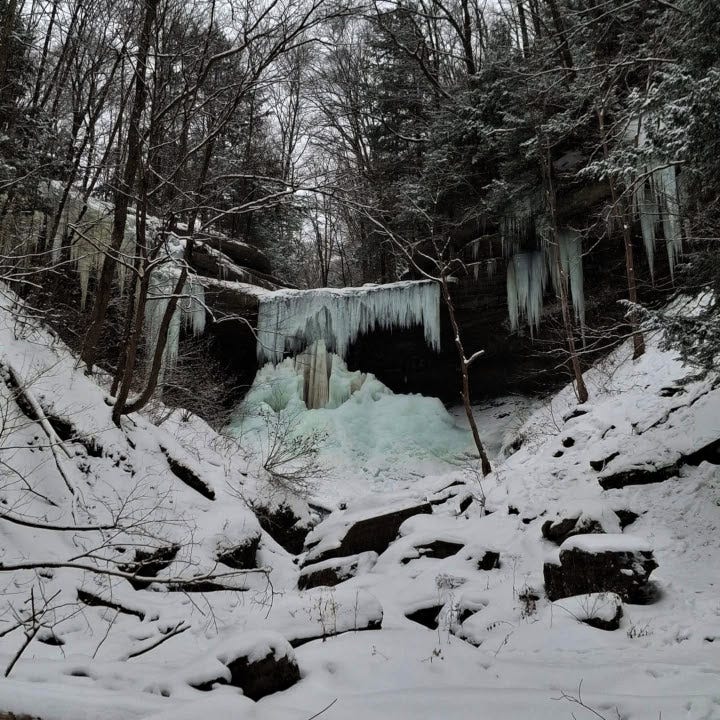 New Year’s Day was too squally and unsafe to drive around, so we postponed our annual walk in the woods to Tinkerfalls, but we finally had our walk in the woods yesterday, and it was really nice. It was lightly snowing, and chickadees were sweetly calling out from the treetops. The stream was running, but partially iced over. In some places, the ice was so solid you could safely stand on it and still hear the water running beneath it. The falls were gorgeous, running water and ice together; it looked like a temple. There were times, many years ago, when the falls were a solid pillar of aqua-colored ice with water running inside it...very cool (and cold.)