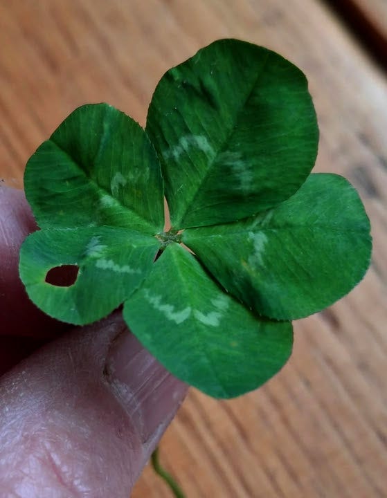 Count them...five...yes, it's a five-leaf clover! It was only the other day that I was thinking that I hadn’t seen one in a long time. I do have three pressed in a copy of Wordsworth. I guess they're considered very rare and extra lucky. (Some lucky bug got to taste it first.)
