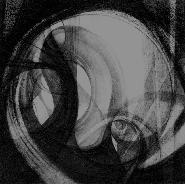 I made this drawing in 2012—it starts with random marks and I follow them with no intention to make anything that looks like something. My Fred insists it looks like a view through the glass bottom of his favorite beer mug, and that he sees a disapproving Jesus looking at him… Since 2012, I’ve been unable to see what the fuck he’s talking about (at times I’ve been annoyed by this nonsense). Then one day (within the last week or two), while I was washing dishes in the kitchen, I briefly glanced at the drawing where it hangs in the dining room, and I finally saw the disapproving Jesus looking through the glass bottom of a beer mug. But… looking at it now, I can’t see it, unless I’m not looking straight at it, but I’m not seeing it like I did that one time...so thankfully, it’s not so obvious that I can’t “unsee” it. It’s funny that I actually did finally see it.