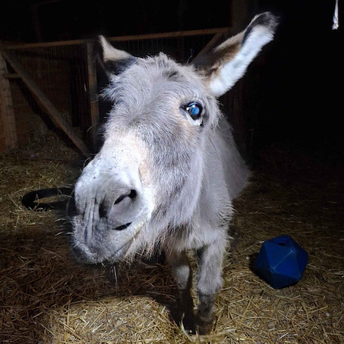 Then, of course, there’s my wee donkey, one early morning. Her blue busy ball that I put cookies into every day, her interactive toy, that on occasion, I can hear her rattling it around the floor to get a cookie out of it. I can’t find the video of her spinning it around to get a cookie (I’ll keep looking).