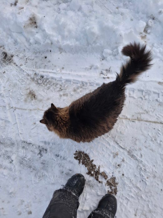 Harper Lee is always excited to see me outside, I have done the best I can to make a cozy place in our barn for her to shelter for the winter, the self-warming beds are amazing, and I’m so glad she uses them to sleep with, they warm to the kitty’s body heat. Her winter coat is very thick and floofy. I have them around the house for the indoor kitties, too.