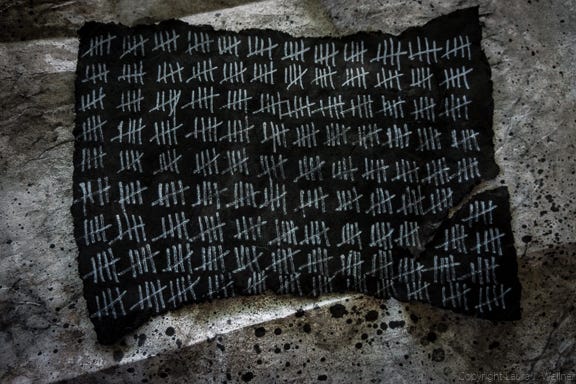 How many seconds spent waiting by the microwave to warm up something to eat? Minutes standing at the stove waiting for the water to boil to cook the spaghetti for dinner Hours spent working at your job to get paid your hourly wage, eight hours a day, forty hours per week. It’s never enough to make ends meet. The few precious hours at home, nesting with your family, friends, and your things that define you. Days waiting for the weekend to be only yourself, not that person who you have to pretend to be at work. Weeks until the next day off from work. Crossing out days on the calendar, counting down to that one extra day you’ve been given to catch a break from feeling pulled in twenty-four directions because of time or the lack of it. Months spent waiting for the baby to be born or the New Year to come— the hope for a better next year. How many years spent going about life, day by day, getting shit done; night after night, sleeping (that is—if your worries will let you.) Making hash marks in fives on the wall as you dictate, record, recall the passage of time. Years, years, years, and years, months, weeks, days, hours, minutes, seconds waiting— How did I get so old? Where did the time go?