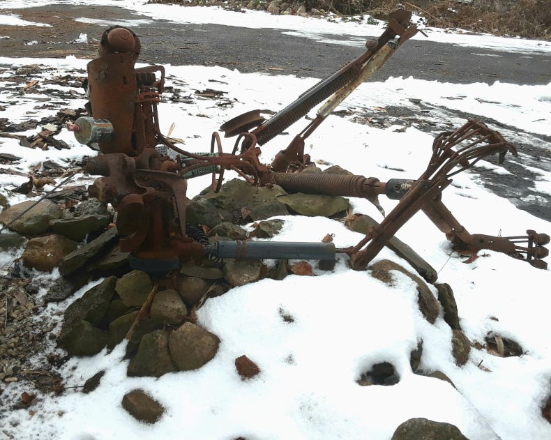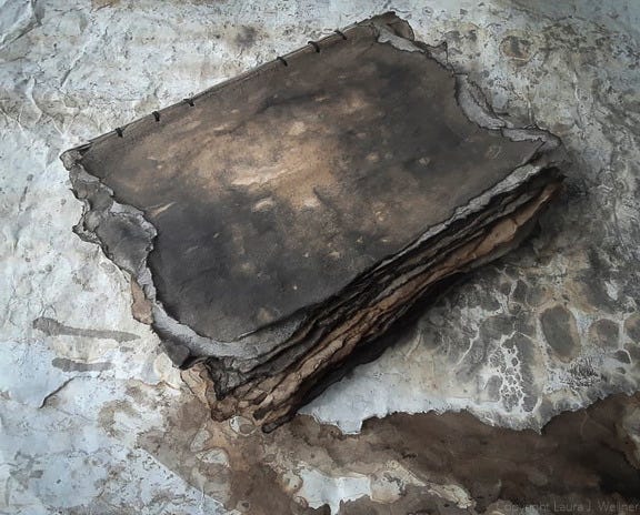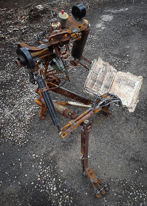 He welded together this fellow from old parts, some dug up from our property or around our friend’s barn, most of them tractor parts, old valves from our boiler, and garage door springs, etc...my part is this handmade book. I worked on it for months, starting around November or December of 2018, staining papers while reading Shakespeare’s Hamlet. It was a fun project, not without frustrations, and it was exhausting at times.