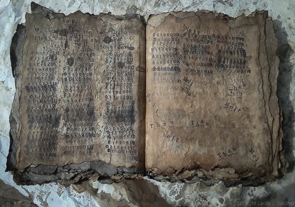 The book is crudely bound in a Coptic-style binding. (I’ve never done it before, so it was a learning experience, and the imperfections were perfectly the way I wanted it.) It has the appearance of an ancient relic. Tattered and stained pages filled with fragments of printed and handwritten quotations, fragments of pages, some of which are translated to binary language of 1’s and 0’s. Some pages are hand-stamped letters and numbers, and most of them are off-register. Some of the pages are handwritten in scribbles, most of which are quotes that have been written and layered and then obliterated, blots of ink, tears, and holes.