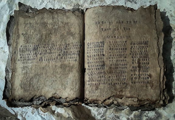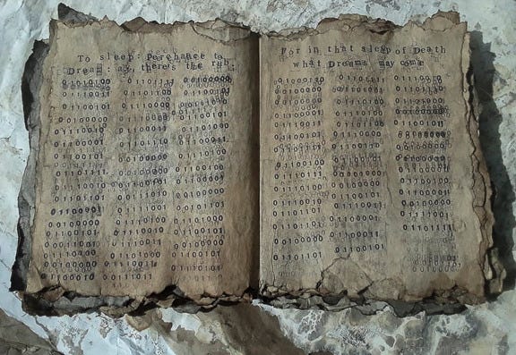 I broke down Hamlet into fragments, mostly focusing on the To Be, or Not To Be soliloquy—one of the greatest and most quoted lines in literature. Death, the “undiscovered country” from which “no traveler has returned,” is a natural human preoccupation. I’ve treated the play much like Sappho’s poetry, a lost and found creation. It is the gathered remains of a culture no longer in existence. The irony of an aging robot finding this battered text and its AI contemplating the meaning of it is devastating.